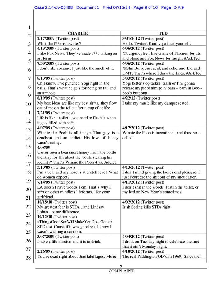 The suit, which also names Universal Pictures and other production companies associated with Ted as defendants, claims that, “Charlie and Ted each have a substantially similar persona, verbal tone, verbal delivery, dialogue, and attitude.” To bolster that argument, the plaintiffs also presented a series of tweets from Charlie the Abusive Bear’s Twitter account and Ted’s Twitter account to show how the two bears “think” alike. Here are their examples of “similar postings”: