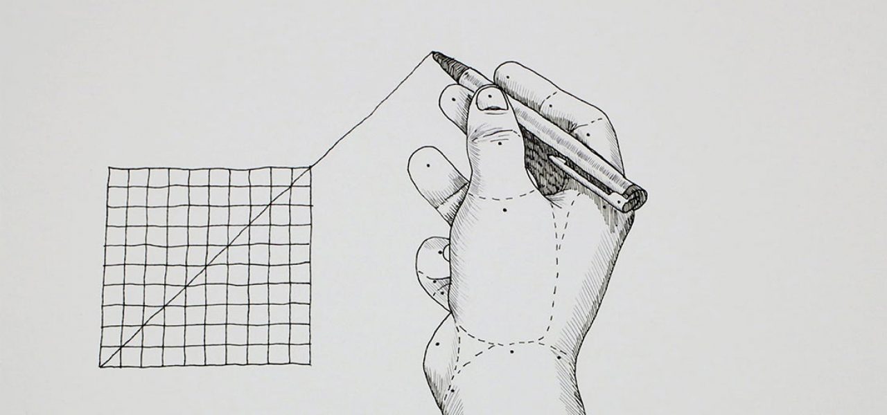 “In this hand-drawn animation a line is being extrapolated through a grid. When the line surpasses the boundaries of the grid, the process spreads to and reflects on its surroundings. Beyond each boundary the extrapolation of movement is causing deformation in a systematic but speculative way.”
