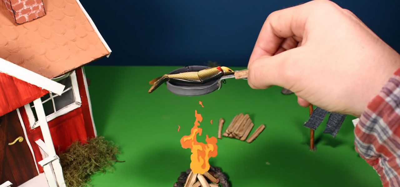 “2500 still pictures (4530 taken) played in 18 FPS. Made in my bedroom on my desk. Shot with a Canon EOS 600D. Animated in Dragonframe, edited in Photoshop and Sony Vegas. Sound effects recorded with a Blue Yeti – a few downloaded from Freesound.org. I animated with branches and leaves, paper, clay, fabric, fishing lures, forks, and stones, and moss and EVERYTHING I could think of.”