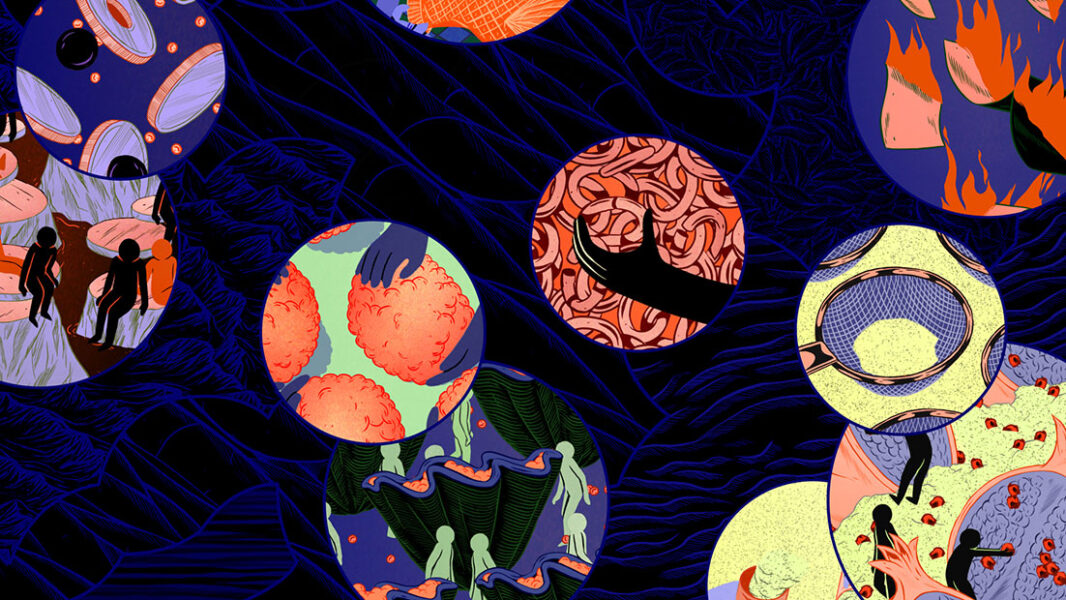 I developed a universe teeming with cycles and magical elements: fruit oil, lave pearls, strawberry skeletons, egg cages, flower pipes… All these become accessories for the humans to explore their own singularity. Yet, by doing so, the collectivity is disrupted. Self-admiration takes over, closing the protagonists inside their own bubble, as the landscape is torn apart. The camera is no longer a window into the macrocosm but a mirror for the characters. In order to visually materialize this shift, I chose to combine two visual spaces: one of timeless, physical geographical maps and scientific illustrations together with the contemporary, virtual space of social media and profile pictures.