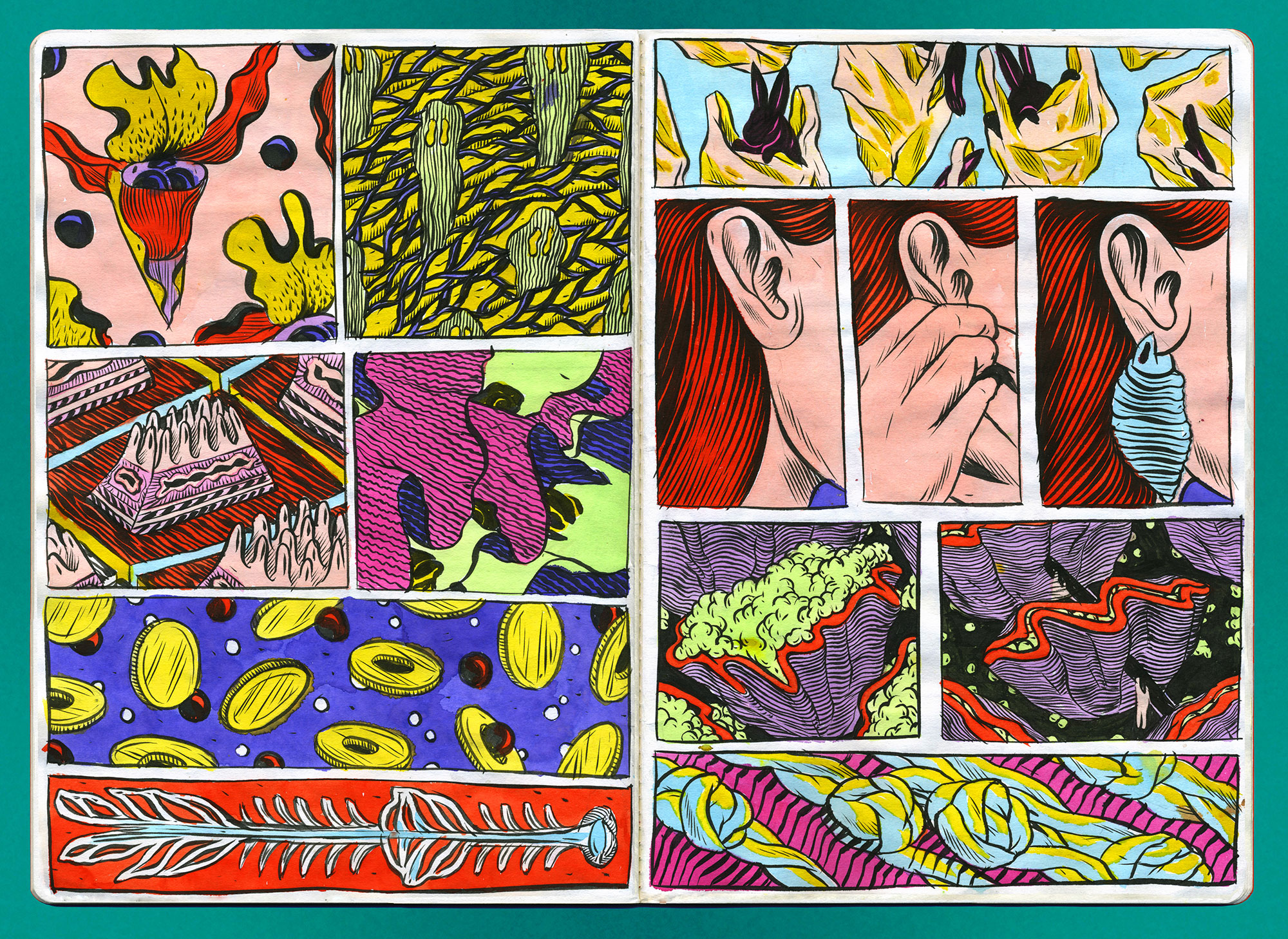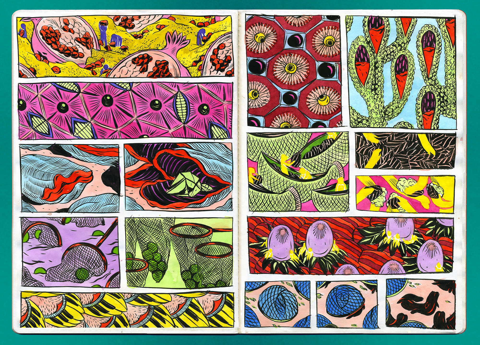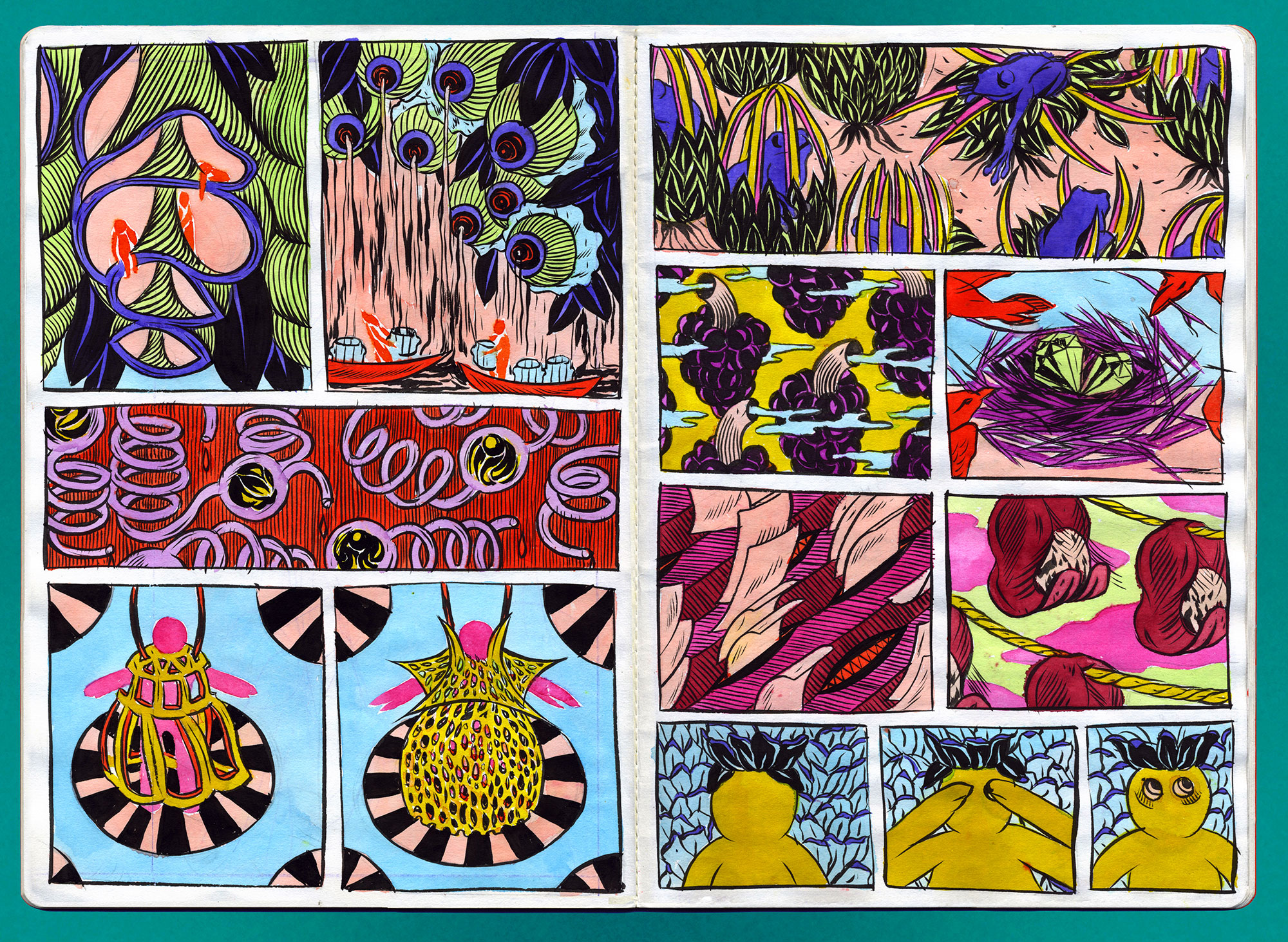 I drew a collection of micro-scenes which all had in common the relationship between living creatures and the way they use and affect their environment. The compositions play with the multiplicity, confusion, and repetition of forms in nature. A trip to Indonesia also impressed me in several ways. Firstly, the art of Batik prints and the symbolism of the patterns, which infused in the artwork for the album. Secondly, the relationship of people with nature: the contrast between the locals blending and manually collaborating with the landscape and the tourists using it as a decor for Instagram selfies. This observation stuck with me for the development of “Careful.”