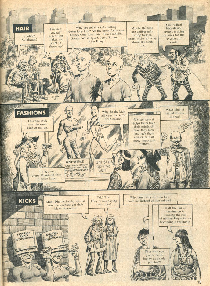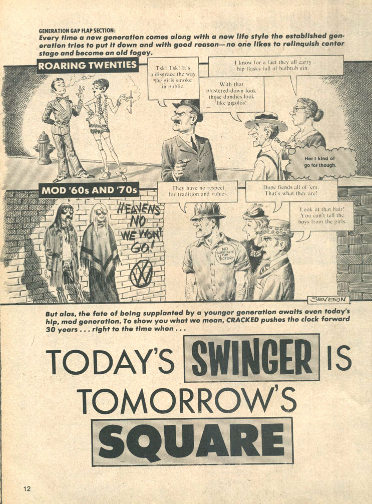 “Today’s Swinger is Tomorrow’s Square”, illustrated by John Severin, appeared in the 1974 annual Super Cracked (It was most likely a reprint from a 1970 issue). In it, the writer predicts that young people will embrace the “skinhead” look, home computers (“Electronic Home Teacher”) and even the ipod: as “electronic brain stimulators” and a “musical computers” that young people are hooked on.