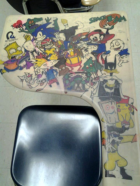 Wanna know what’s on the mind of college students these days? Perhaps this photo of an elaborate desk doodle is the answer. Found on the image sharing site Imgur.com. Nice job!
