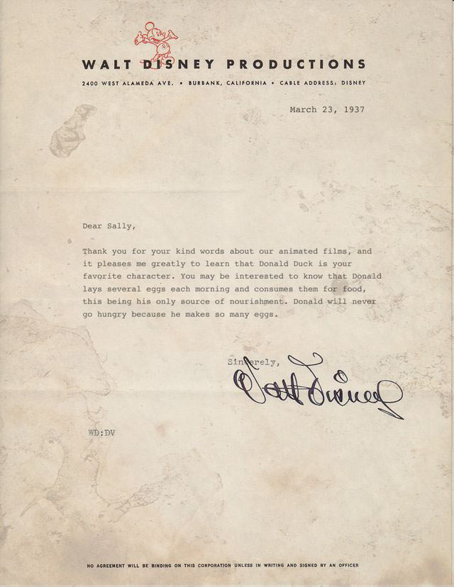 Clickhole, the satirical Onion spinoff site, has published a “newly discovered” series of notes from Walt Disney to his employees, fans, and John F. Kennedy, in which he explains the truth about Donald Duck and his eggs.
