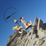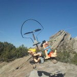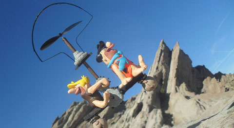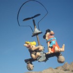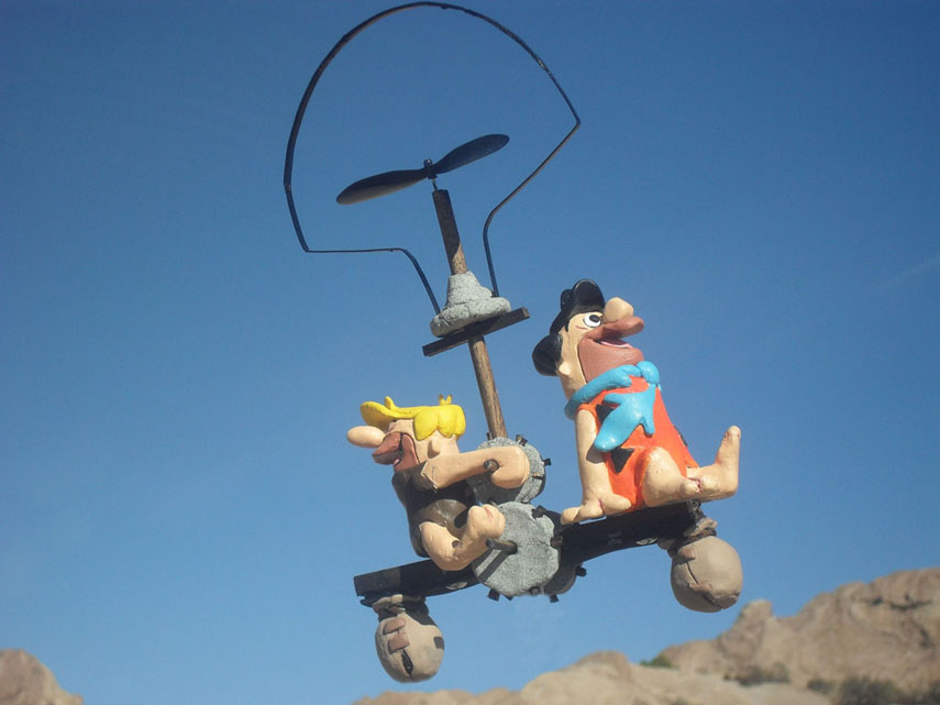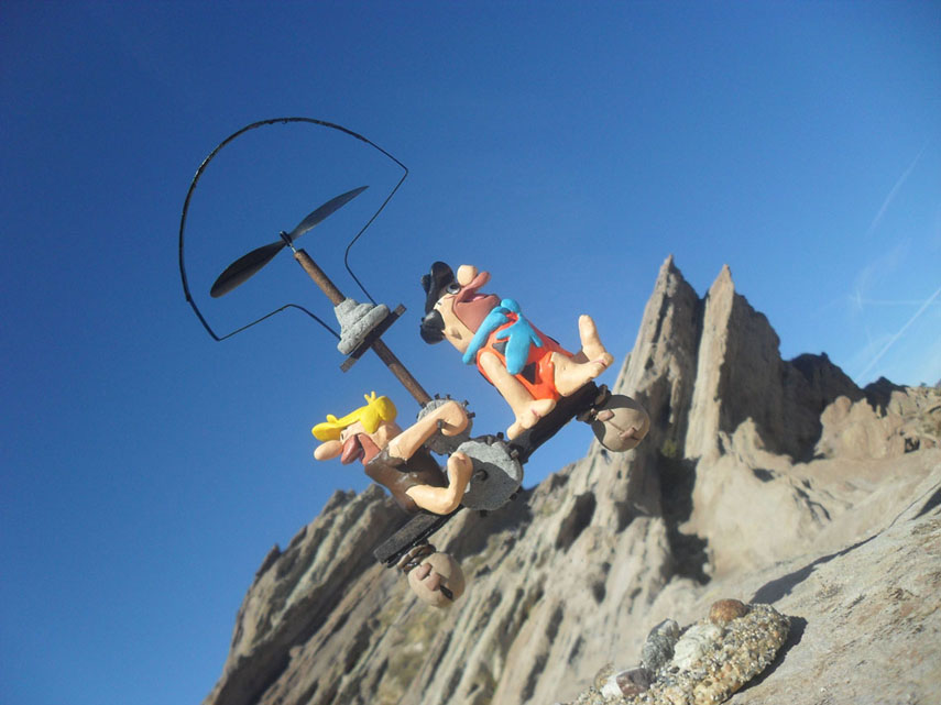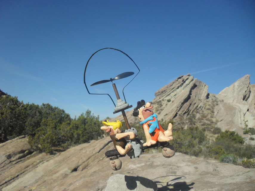 Calling all Flintstone freaks! My friend David Nimitz is an animator, caricaturist and Flintstone fanatic par excellence. He always wanted a toy based on the first aired episode of the series, The Flintstone Flyer, but since none existed he built one himself. He took his prehistoric helicopter out to the Vazquez Rocks and shot a few pix (above and below) – and I just had to share. Well done, Dave! Perhaps these will inspire some toy-maker to create a mass-market version. Till then we will play vicariously through your photos…