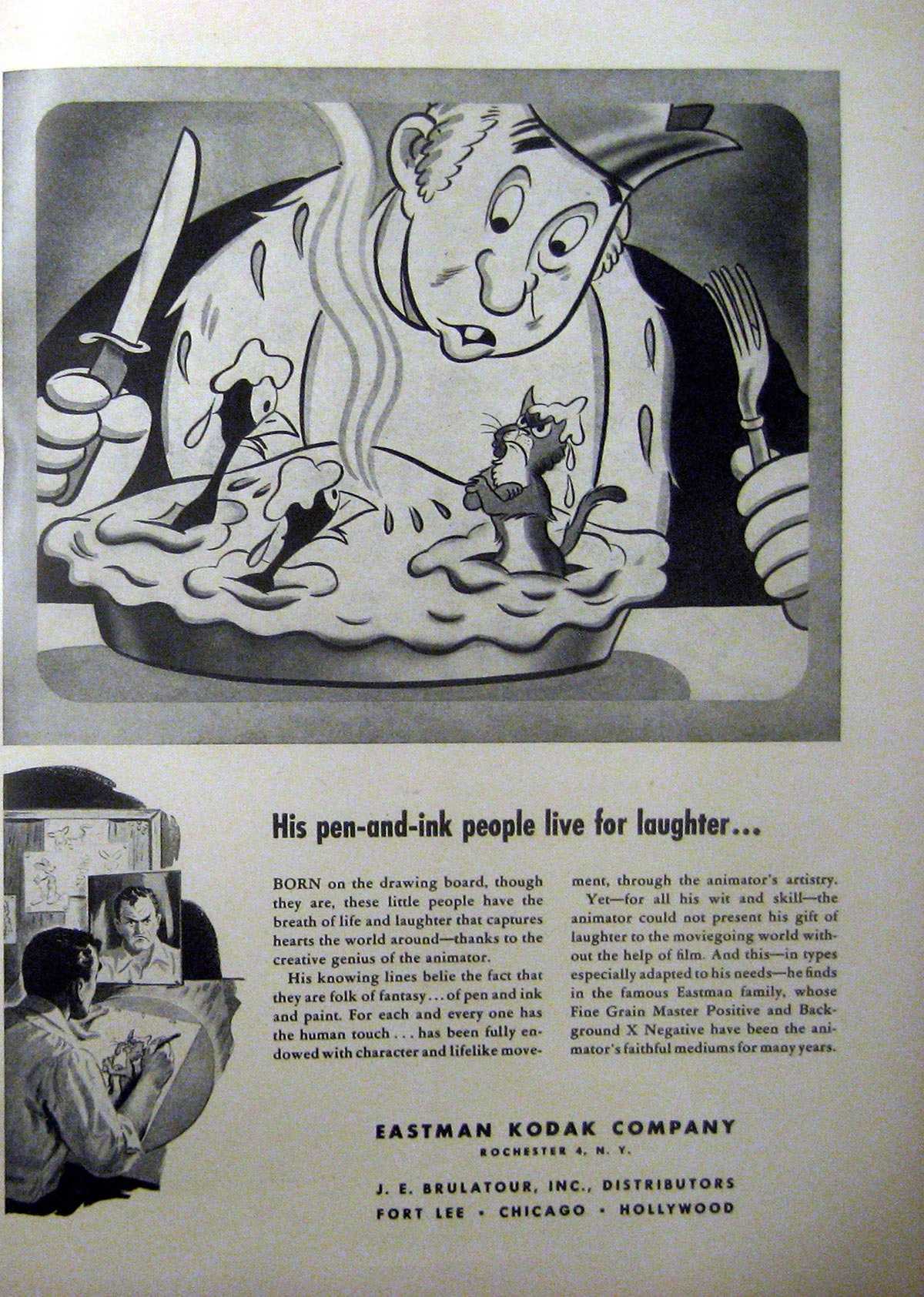 Below is an Eastman Kodak ad I spied recently in a 1950 edition of The Hollywood Reporter. I love the headline copy — “His Pen-and-Ink Live For Laughter…” — juxtaposed against the angriest illustration of an animator I’ve ever seen (click for a larger view). I realize the animator is angry because he’s working out the expression he’s drawing, but it still strikes me as funny. Regardless of its humor value, it’s still a kind of cool historical curio.