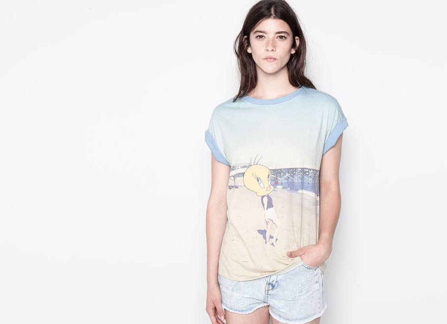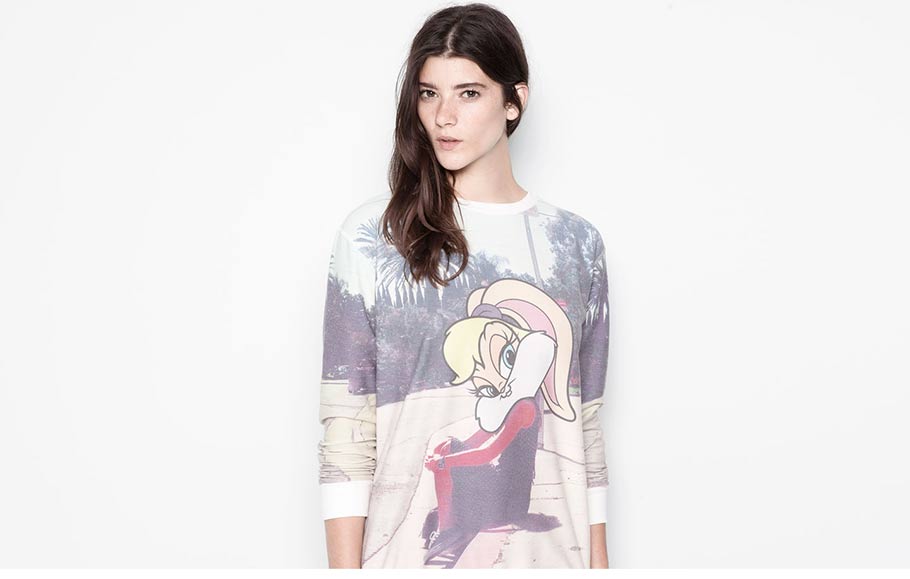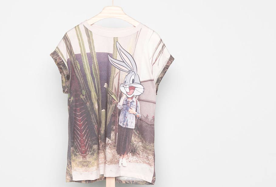 Twenty years ago, we had ‘urban’ versions of the Looney Tunes plastered onto merchandise. Today, we have the characters being pasted on top of human bodies. Bugs, who is traditionally male, is gender-fluid now, with a male head and female body. These shirts are being sold by the Spanish clothing retailer Pull & Bear. Click on any of the images for a larger version.