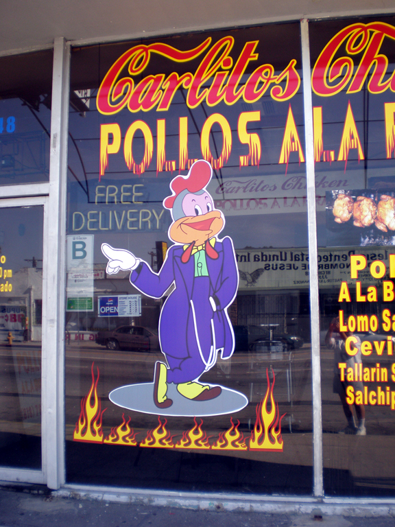 Over the weekend, Mike Kazaleh snapped this picture (above) of the window of a North Hollywood chicken resturant. Their mascot is an obvious swipe of Paramount Pictures beloved (and long-forgotten) 1940s cartoon star, Henry the Henpecked Rooster (at left, with co-star Herman the Mouse). Did they think we wouldn’t notice? I love how he’s dressed like a pimp and pointing towards the resturant’s “B” rating.