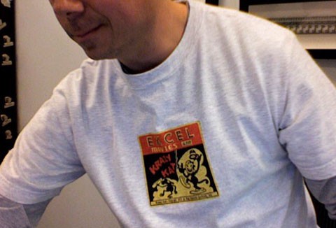 Photographer Vincent Gonzales has a very small line of stylish tees based on found objects. He has a shirt based on an old Krazy Kat 16mm cartoon film box (above) that I absolutely love. It isn’t posted on his website, but you can order it in any style (men’s, women’s, babies) and on any color if you request it. I got a long sleeve black shirt with this design and I love, love, love it.