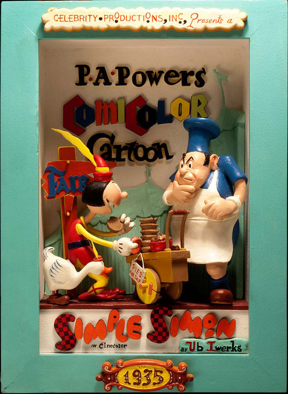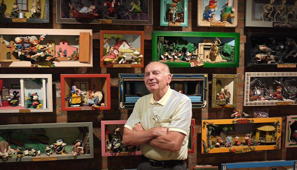 Collector Mel Birnkrant has posted an amazing story – and gallery – of art created by amateur wood carver Charles Ponstingl. Beginning in 1973 Ponstingl began (at age 38) carving over 200 wood dioramas, creating three-dimensional shadowbox homages to beloved comic strip and animated cartoon characters.