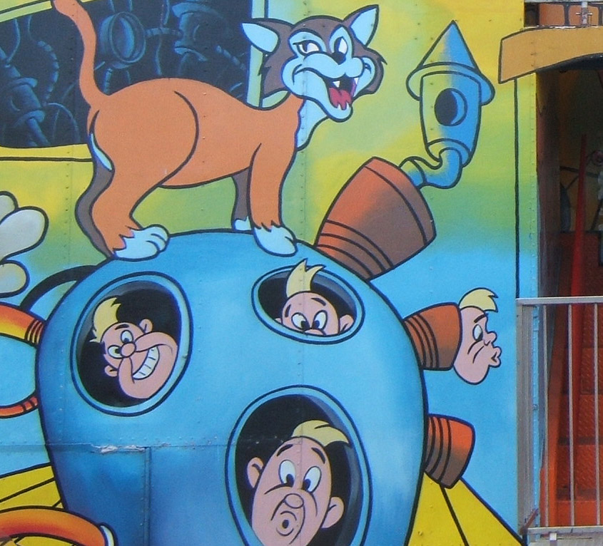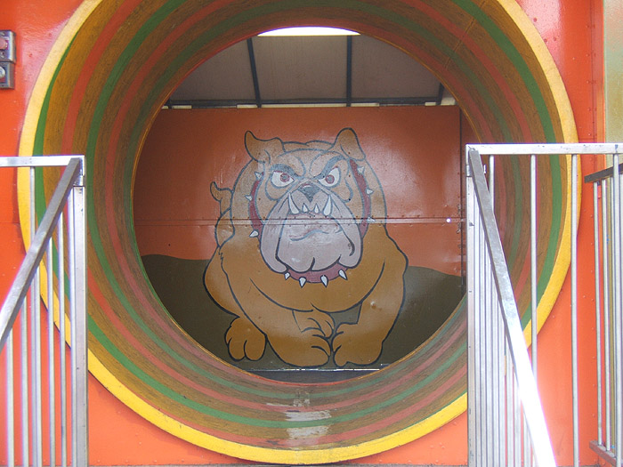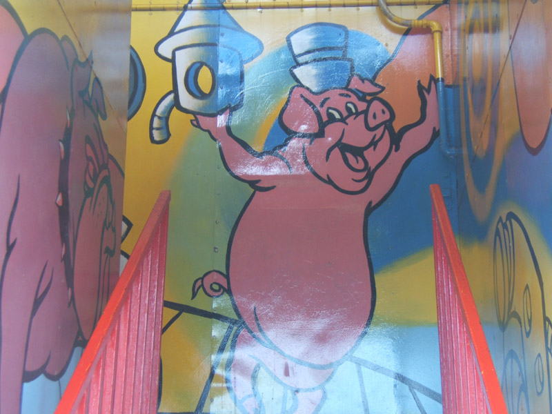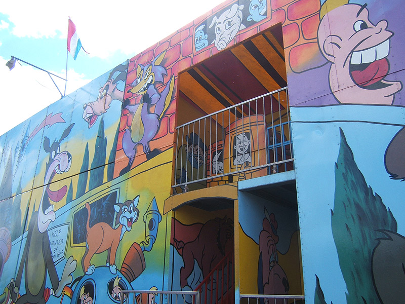 Then, turning the corner, I see THIS. I’ve seen a lot of things before, but this is far, far beyond the normal Blair ripoff; it’s almost an outsider art homage! I took a bunch of pictures (forgive my not quite perfect alignment of the whole thing…). I have more if you want, but I think these tell the story pretty well. This is a walk though carnival attraction. I didn’t go inside, but I bet I would have seen Red in progression, the policeman and maybe even the hippos from Fantasia…