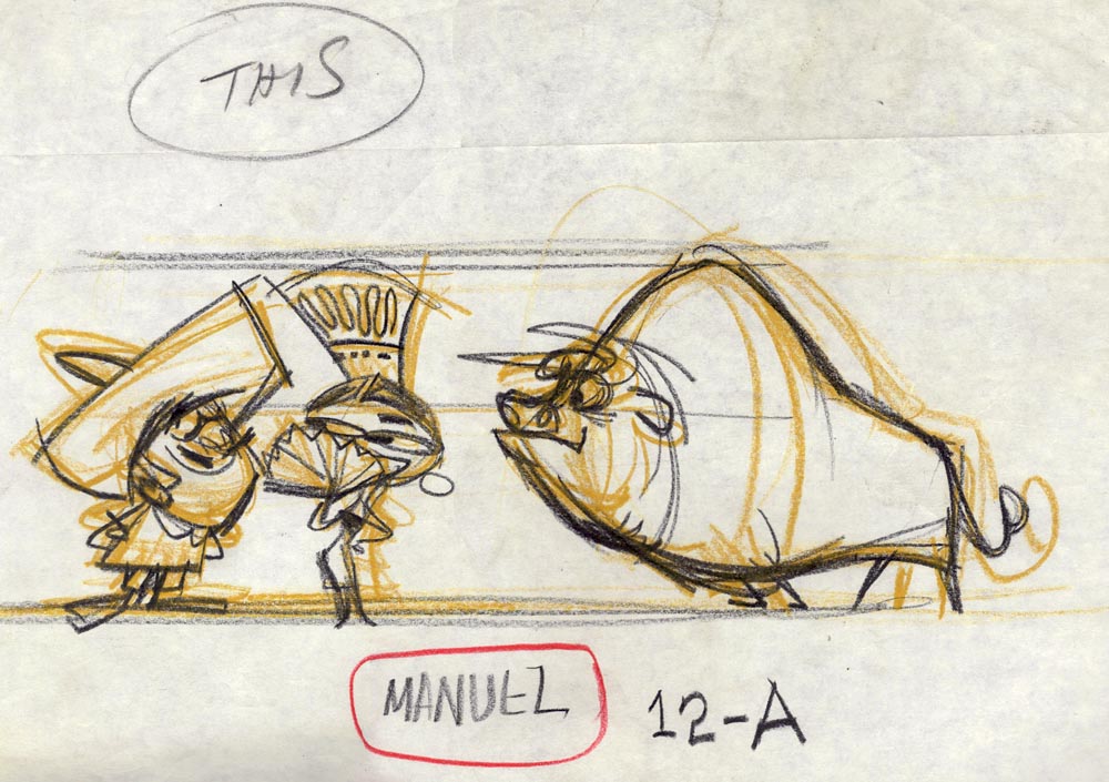 Of course, Manuel was Go-Go Gomez from UPA’s Dick Tracy Show (1961). Why I didn’t recognize this at the time is another question, but quickly flipping through hundreds of pages of similar looking artwork can fry your perception abilities. The only thing I knew is that I really liked the grouping of characters. What’s funny is that I had also unwittingly gravitated to a drawing that is almost certainly by my favorite designer of the Cartoon Modern period, Tom Oreb.