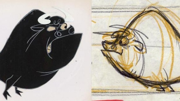 Throughout his career, Perez had kept a morgue file of animation character designs drawn by other artists. Most of these were random drawings that he picked up around the places he worked—quick sketches, discarded character model drawings, rough designs, and other ephemera that would have been lost if not for his collection. Many of the pages had multiple drawings pasted up of a particular subject, like old ladies or cats. There were few recognizable cartoon characters, but the collection was excellent reference for anyone who had to draw in a vintage TV style.
