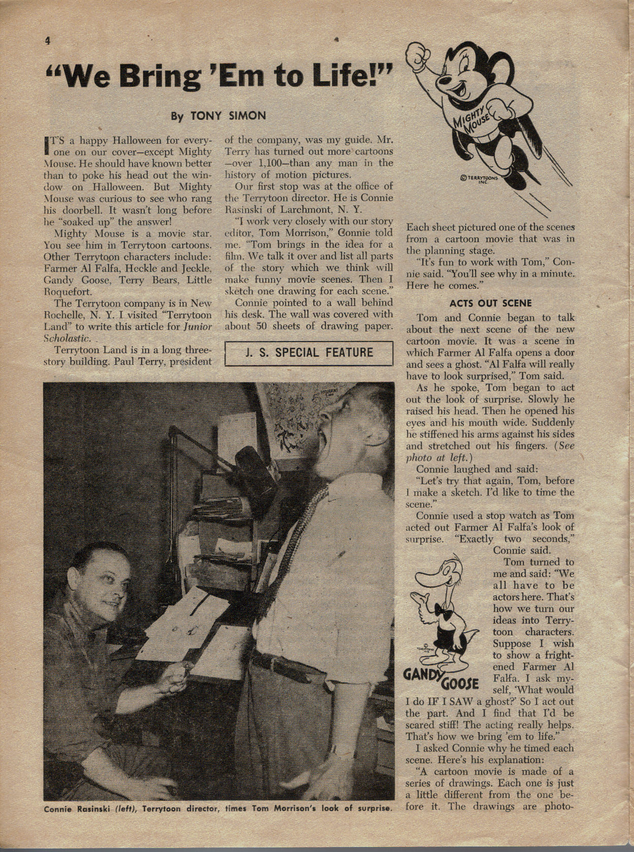 Animator Mark Kausler (who has a great new blog, by the way) recently unearthed this 1955 article on Terrytoons, written for children, from Junior Scholastic magazine. This was written shortly before the studio was sold to CBS and Paul Terry himself retired. The piece explains the basics of how animated cartoons were produced in ’55, with a great photo we hadn’t seen before of director Connie Rasinski and storyman/voice of Mighty Mouse Tom Morrison. Mr. Terry also has a great quote at the end: