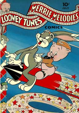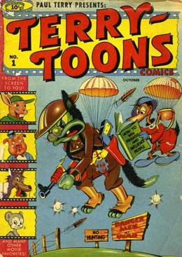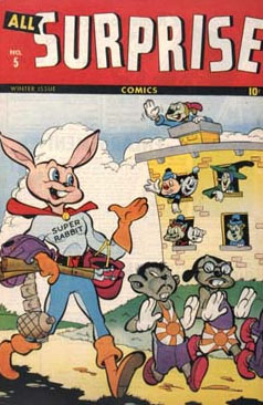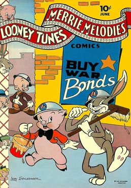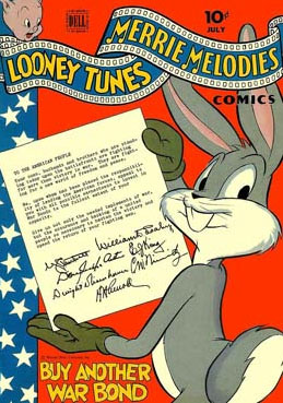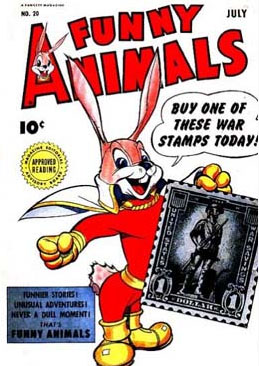 Courtesy of some quick research on Mike’s Amazing World website, I created a gallery of 15 comics covers from the war years (thumbnails below) – featuring popular characters from Disney, Warner Bros., Terrytoons and Walter Lantz as well as some lesser known rabbits from Fawcett and Timely. Characters from from MGM, Famous Studios and Screen Gems also did their bit – on screen.