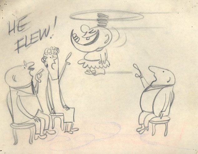 This is also one of the “Harveytoons” not contained in Classic Media’s Complete Harveytoons DVD collection. Mike Van Eaton (of Van Eaton Gallery) recently unearthed a cache of original Spector storyboards from this film (click thumbnails below to enlarge). These drawings are a lot of fun – and this film may be the closest representation of Spector’s design style to make it faithfully to the screen.