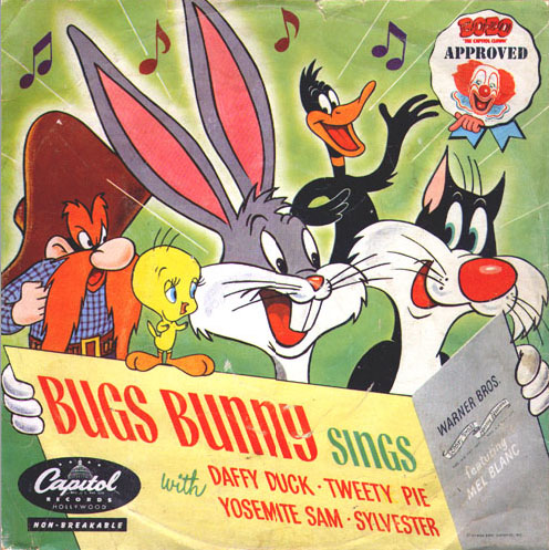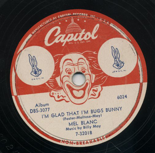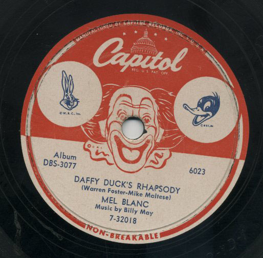You can listen to the classic Daffy Duck’s Rhapsody on You Tube — as well as it’s flip side, I’m Glad That I’m Bugs Bunny, both written by Warren Foster and Michael Maltese, with incredible vocals by Mel Blanc. For more information on vintage Looney Tunes recordings, visit Golden Age Cartoons. Click thumbnails below see larger images of the labels and record sleeve.