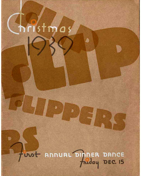Ginny has posted 86 Fleischer staff Christmas cards, from the likes of Max and Dave Fleischer, Dick Huemer, Shamus Culhane, Al Eugster, Ted Sears, Dave Tendlar and dozens of others. In addition, she’s uploaded rare footage from the 1935 Fleischer Studio Christmas party, and the entire contents (24 pages) of the 1939, 40 and 41 Flipper Club menus and program books. These rare items contain articles by Pinto Colvig, Tedd Pierce and Dan Gordon, and rare artwork by Grim Natwick, Dave Tendlar, Gordon Sheehan and lots of lettering my the mysterious Fleischer/Famous calligrapher (the cover for the 1939 edition – thumbnail below right – gives a credit “Cover design by Arthur Greenbaum”. Is that the mysterious Fleischer lettering genius?).