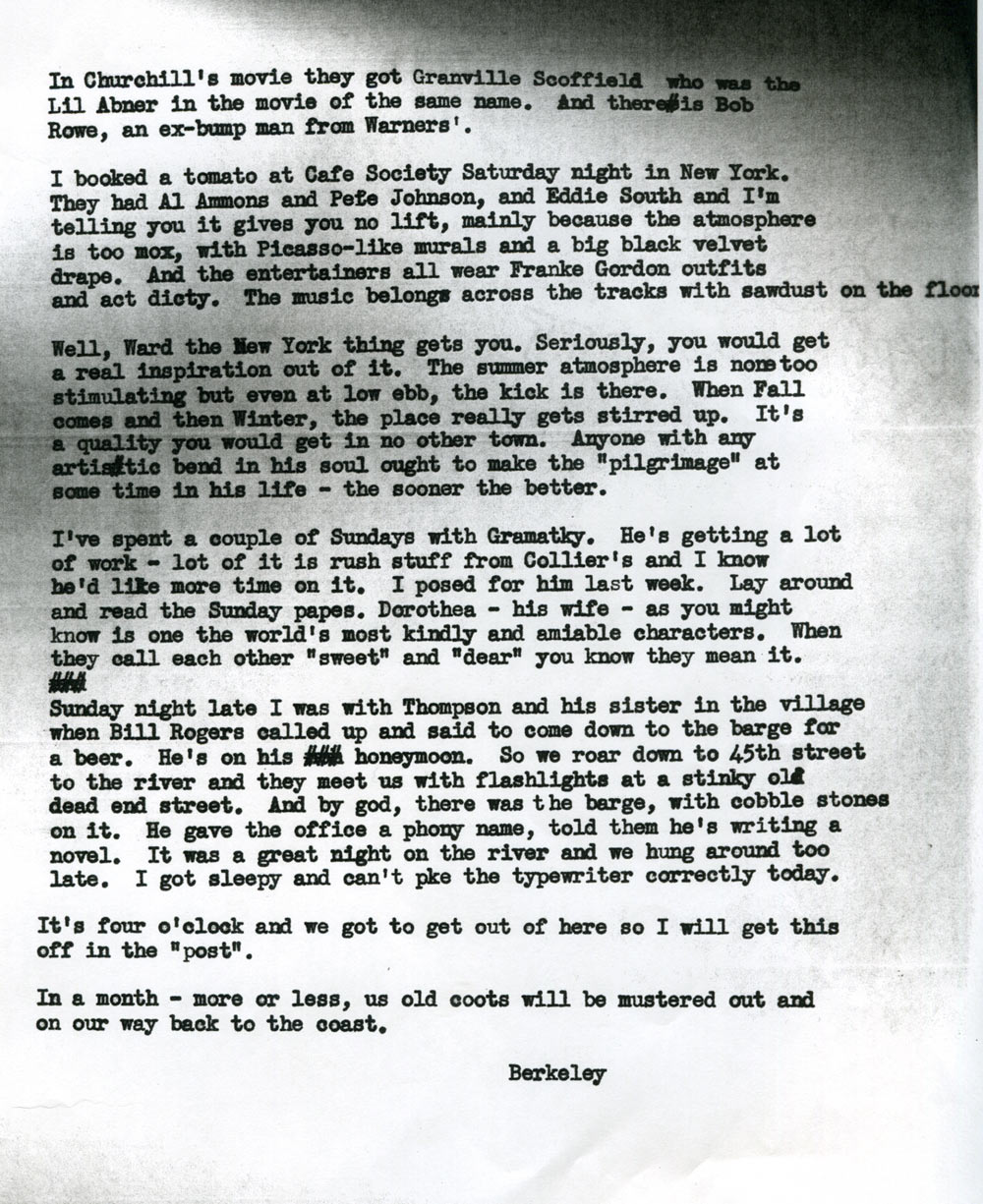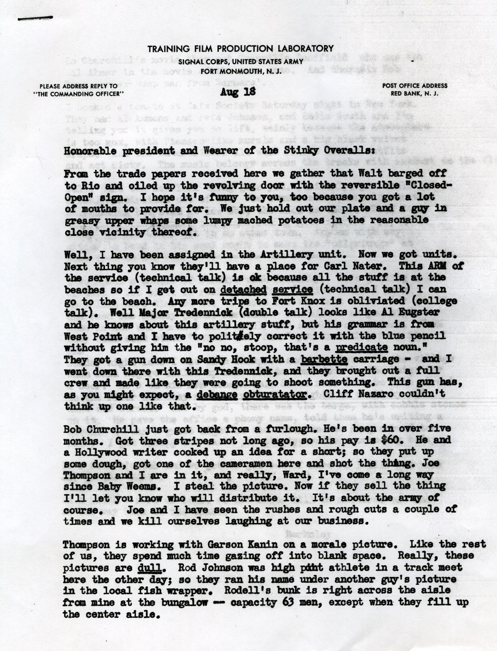 During World War II, dozens of Disney artists were drafted into the US military. Today I’m sharing letters written by three of those artists who served in uniform—Berk Anthony, Carl Fallberg and David Swift. The letters were all addressed to Ward Kimball, who continued working at Disney’s Burbank studio during the war. Not only are the contents of the letters fascinating but also the artists’ writing styles which exhibit a surprising level of literary sophistication. I’ve annotated the letters with some information about the artists as well as references they make in their writing. Please add your own notes if you know any more about what is described in these letters. Click on each image to see the full page.