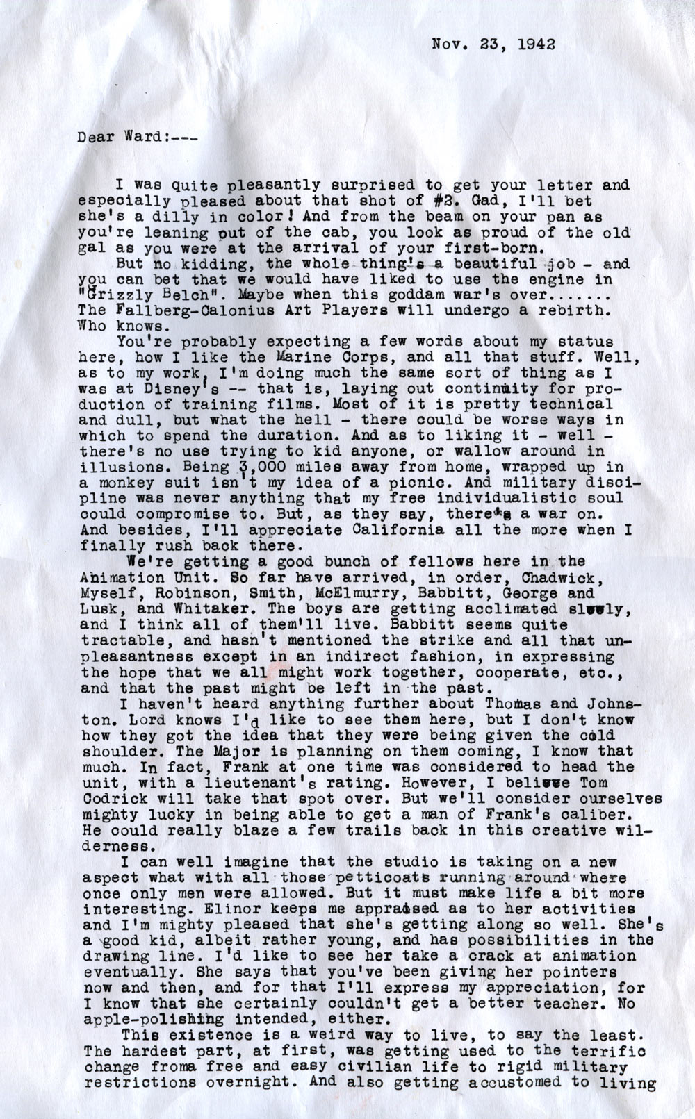 In the 5th paragraph, he says that Frank Thomas was being considered for the unit; Thomas eventually ended up directing animation in the First Motion Picture Unit of the Air Force stationed in Culver City, California. As Fallberg states in this paragraph, Disney layout artist Tom Codrick would become the head of the animation unit in Quantico. In the 6th paragraph, he thanks Ward for giving animation pointers to his sister Elinor Fallberg. In the 9th paragraph, he writes about visiting his live-action filmmaking partner, Lars Calonius, who was in the Army’s Signal Corps film unit further north on the East Coast. (Calonius stayed in New York after the war and ran a successful TV commercial studio for many years.) In the 12th paragraph, he references G.F.R.R.–the Grizzly Flats Railroad–which was the official name of Kimball’s backyard.