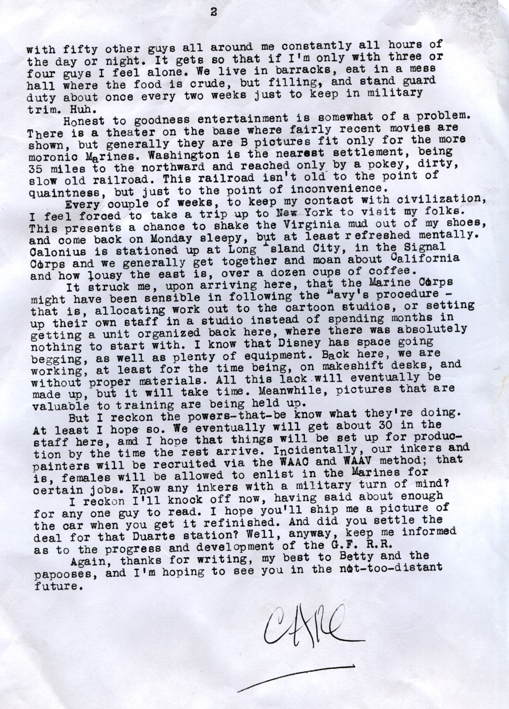 The unit housed an impressive group of people including not only the animators that Fallberg mentions in his letter but also actor Tyrone Powers, director Richard Brooks and the future Abstract Expressionist painter Richard Diebenkorn. In the 1st paragraph, Fallberg thanks Kimball for the shot of #2, in reference to the train that Kimball was restoring at his home. In the 2nd paragraph, Fallberg references a live-action feature that he had made with fellow Disney animator Lars Calonius. The one hour and fifteen minute Western parody was partly shot at Kimball’s home using his #2 train, the Emma Nevada. In the 4th paragraph, Fallberg lists the Disney artists at Quantico at the time of the letter, who were Ralph Chadwick, Keith Robinson, Walt Smith, Charles McElmurry, Art Babbitt, Nicholas J. George, Don Lusk and Jack Whitaker.
