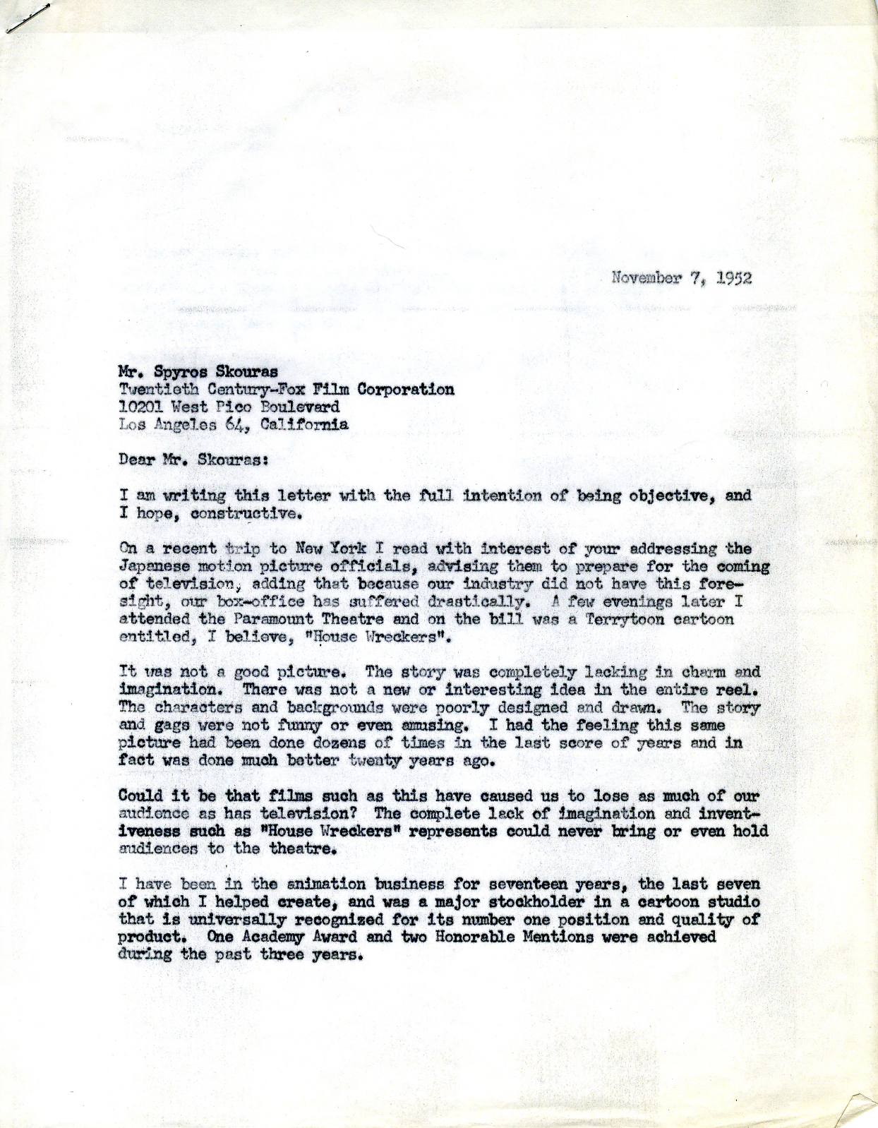 In this initial letter from November 7th, 1952, Woolery, who has just established his offshoot animation studio Playhouse Pictures, complains to Skouras about the quality of Fox’s Terrytoons (in particular, a Heckle & Jeckle short named House Busters):