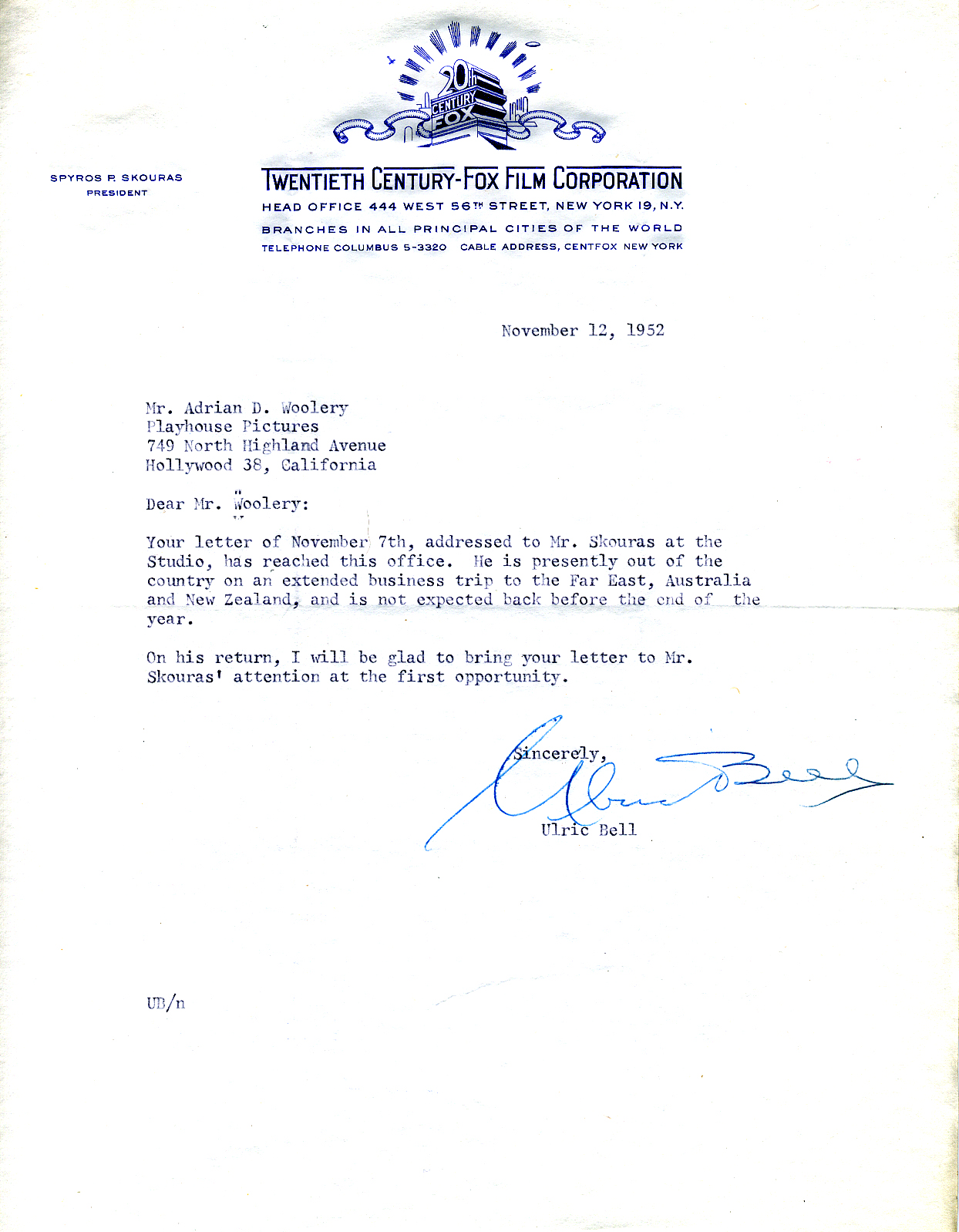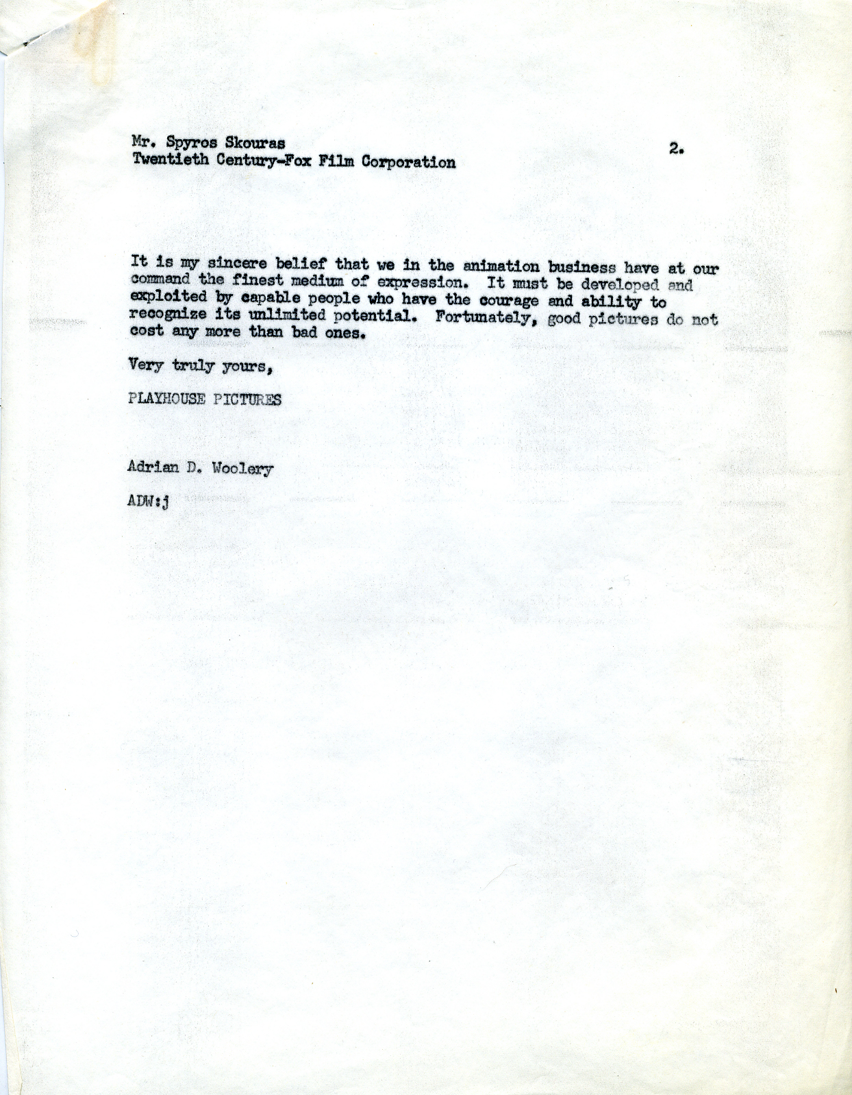 Several years ago, when Playhouse Pictures closed its Hollywood office, cartoonist Mike Kazaleh purchased some old files being sold off in their garage sale. In one of the folders Mike found this intriguing bit of correspondence (click on pages below) between UPA Vice President and Production Manager Adrian Woolery and Spyros Skouras, President of 20th Century-Fox Film Corporation.
