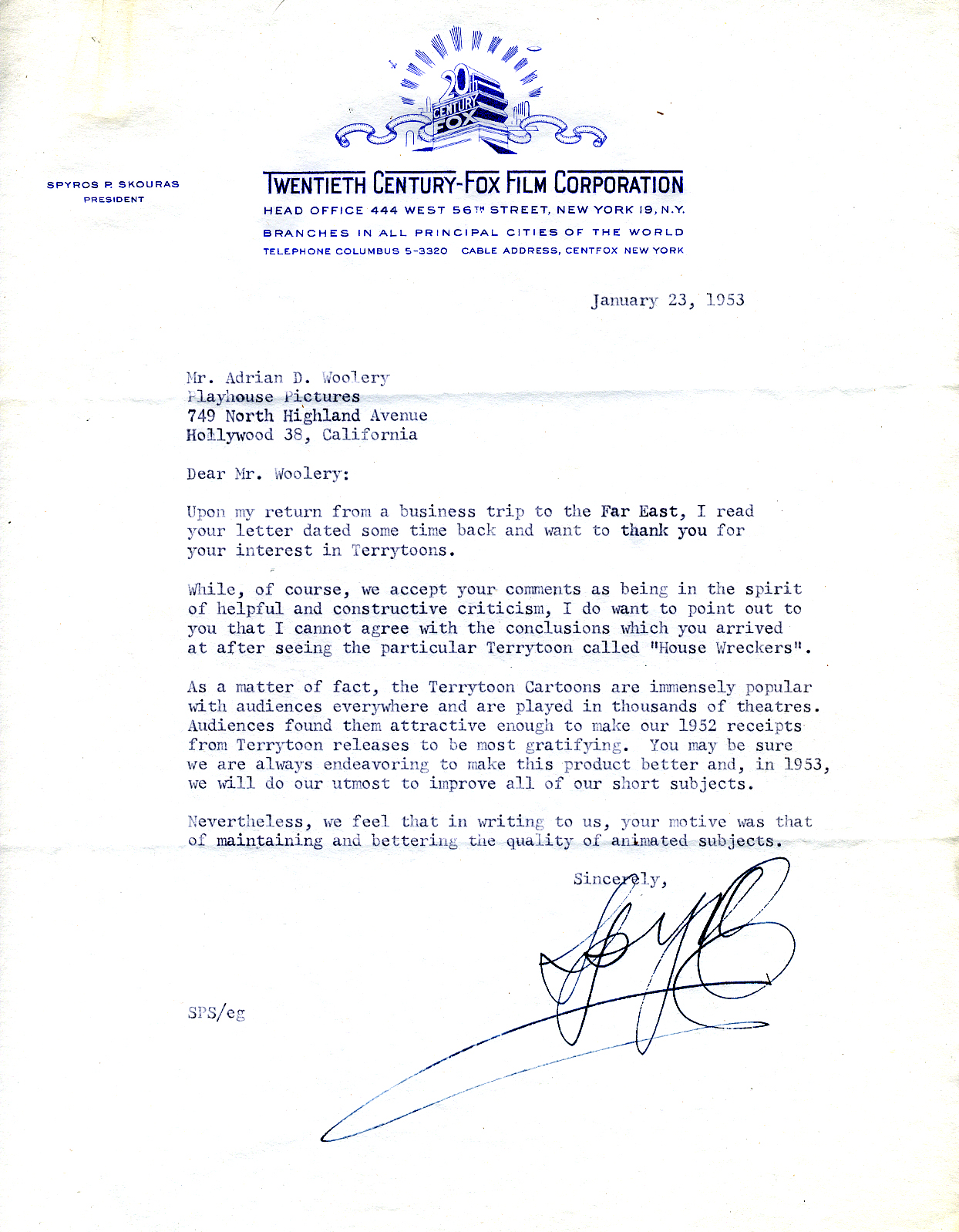 Was Woolery trying to convince Skouras to drop Terrytoons and commision Playhouse to provide modern cartoon shorts, as UPA did for Columbia? Skouras replied on January 23rd, 1953 (click letters at left), that he was quite pleased with the Terrytoons as is: