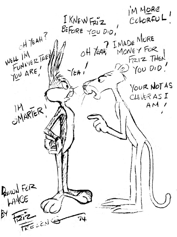 Animator Mike Kazaleh found this incredible Pink-Panther-meets-Bugs -Bunny sketch by Friz Freleng (click on thumbnail below to see full image). Says Mike: