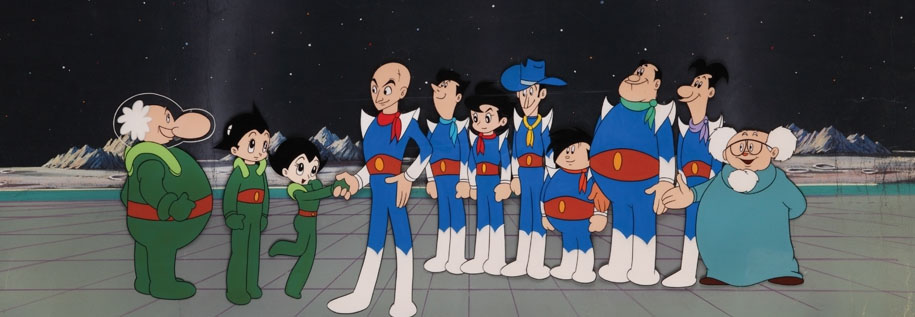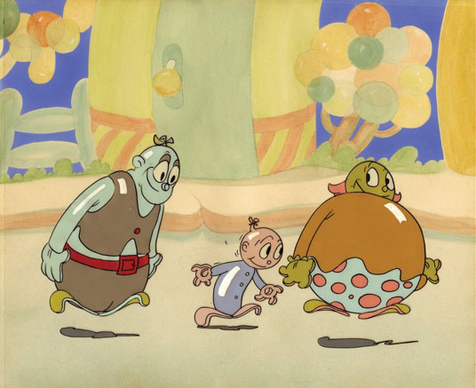Click thumbnails below to enlarge images – L to R: a pan cel from Tezuka’s Astro Boy; The Icons of Animation catalog with the earliest surviving color Mickey Mouse Cel on the cover (note the green trunks!); and an incredibly rare cel set up from Iwerks’ Balloonland (1934):