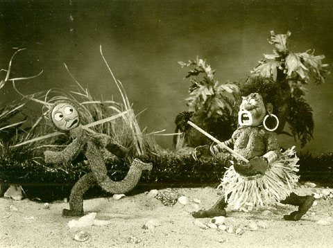 I just received Profiles In History’s latest auction catalog: Icons of Animation and its pretty incredible. Above are a few of the offerings that caused me to do a Tex Avery double take: a rare cel from one of The Flintstones sponsor bumper for Winston cigarettes; pencil animation from MGM’s Bosko and The Pirates (1937); and a cache of production photos from the Kinex stop motion studio – the one above from The Cannibal Isle (1927). Priceless stuff!