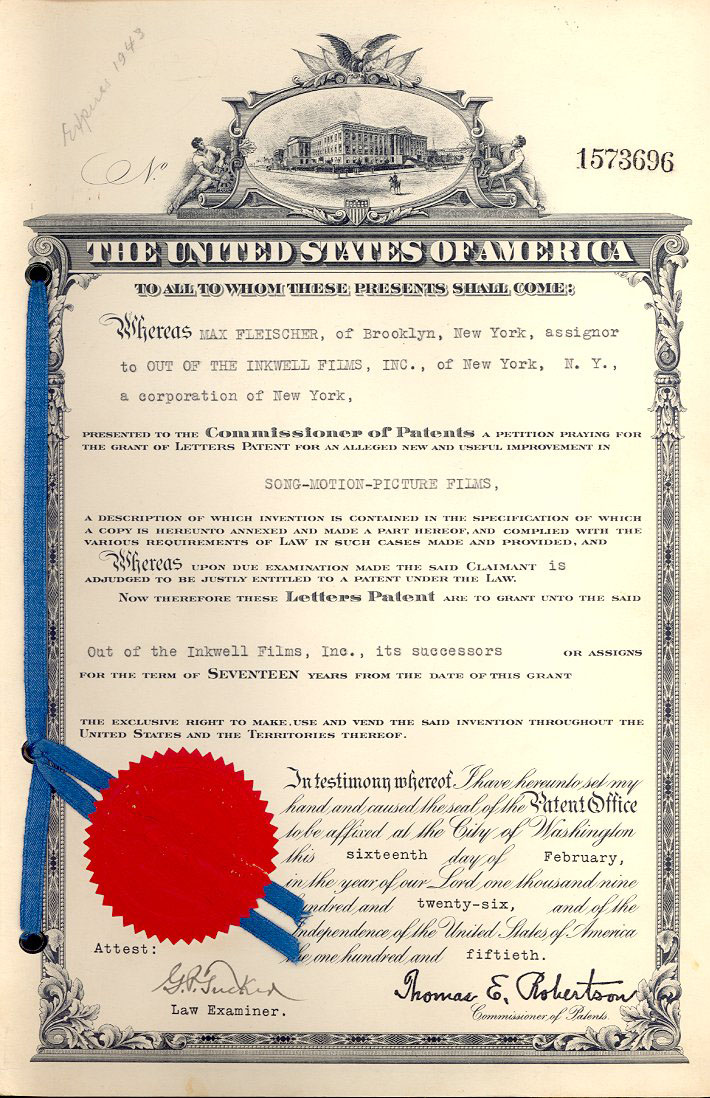 Submitted for your educational pleasure – another historical find from our friends at the Van Eaton Galleries: The patent for Max Fleischer’s bouncing ball cartoons (filed in 1925, granted in 1926).