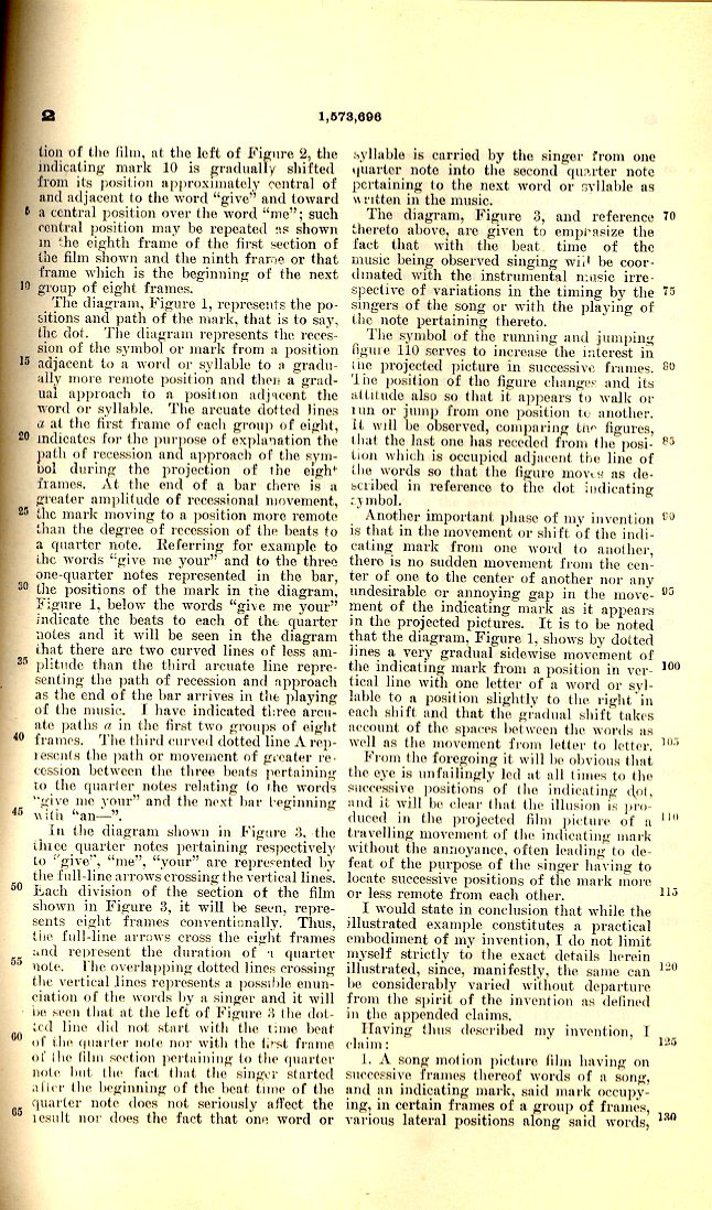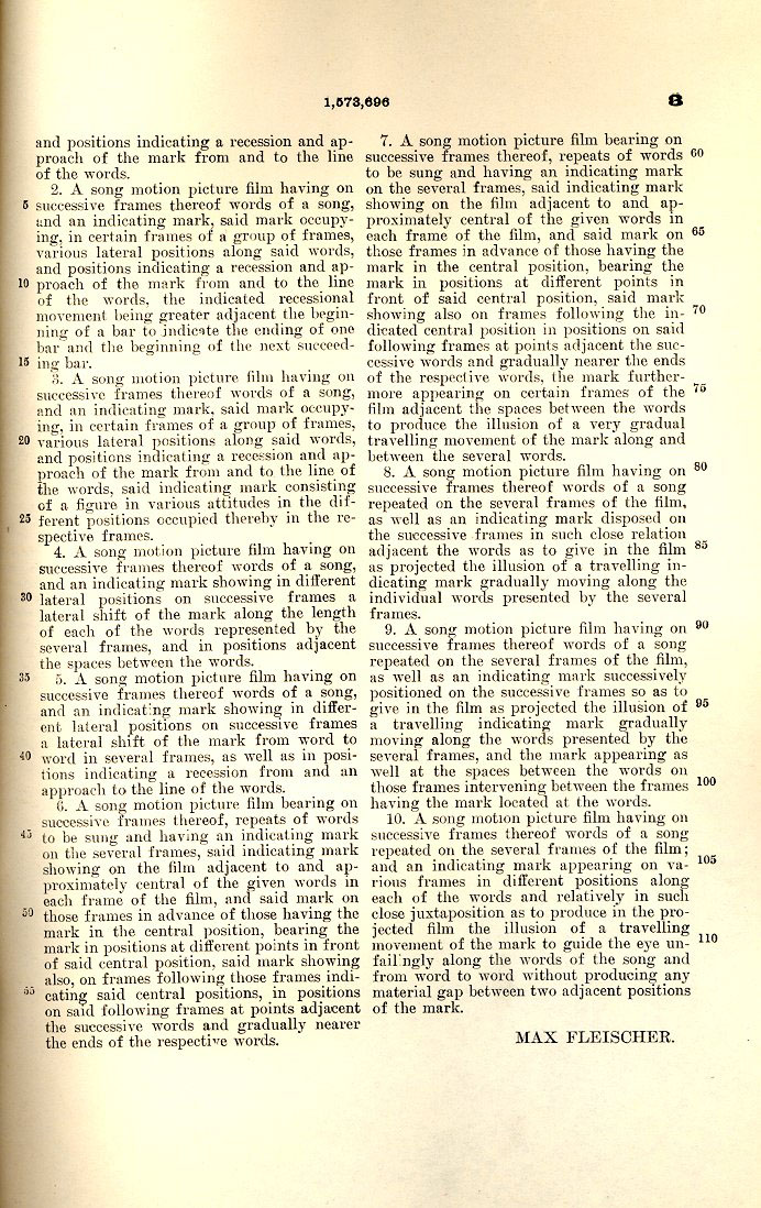 Click on thumbnails below to read the convoluted legalese that Fleischer uses to describe his new technique. Note they use Daisy Bell (“A Bicycle Built For Two”) as a sample lyric. Great find – thanks Mike!