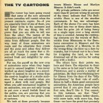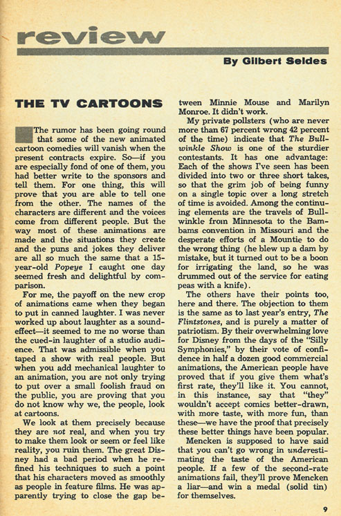 In the center, a review of “TV Cartoons” from the December 30th, 1961 edition. Esteemed critic Gilbert Seldes (The Seven Lively Arts), in the brief space alloted, manages to praise early Disney, Bullwinkle and “a 15-year-old (Paramount) Popeye” – while putting down the use of canned laughter, The Flintstones and Disney realism. A good read.