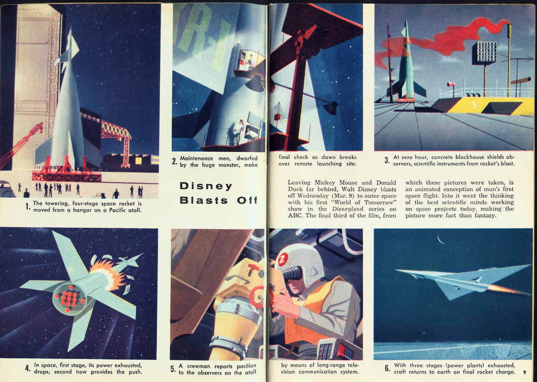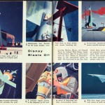 Three more vintage pieces from TV Guide, presented for your historical reading pleasure. Click thumbnails below to enlarge and read. First up, on the far left below, a color spread on Ward Kimball’s first Tomorrowland episode Man In Space from the March 5th, 1955 issue.