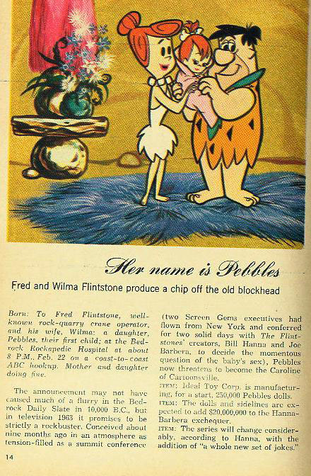 Finally, on the far right, a page from the February 16th 1963 issue commemorating the birth of Pebbles on The Flintstones.