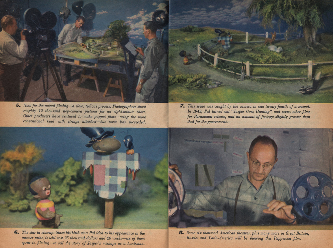 As a follow up to my posting a 1943 Look Magazine article on George Pal, Brew reader Kevin Kidney sends us this April 1944 Coronet Magazine article. Lots of neat things to look at here, including famed sculpter Wah Chang (in picture #3), and the fact that they are making Jasper Goes Hunting, the one with a cameo by Bugs Bunny. Click on thumbnails below to view at full size.