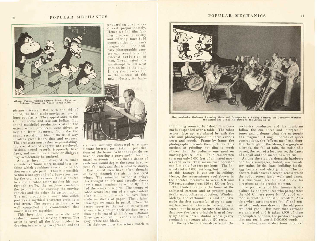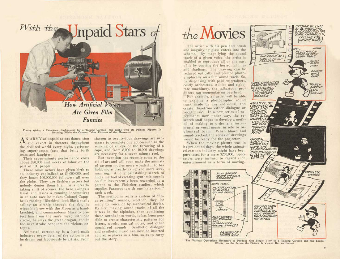 This 1930 article from Popular Mechanics magazine (below) tries to explain the process of recording sound for animated cartoons in pseudo-scientific terms. There are all kinds of interesting and oddball facts bandied about, such as cartoons costing $20,000 per reel, and the artists themselves being able to draw the dialogue soundtrack (Huh??). The images are cool, and one seems to demonstrate an early method of matte photography. In a particularly dated reference the article’s author, in explaining that cartoons are popular all around the world, says, “They appeal alike to the Chinese Coolie and the Alaskan Indian”!