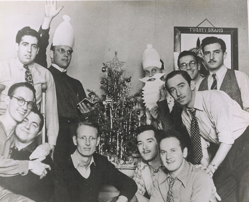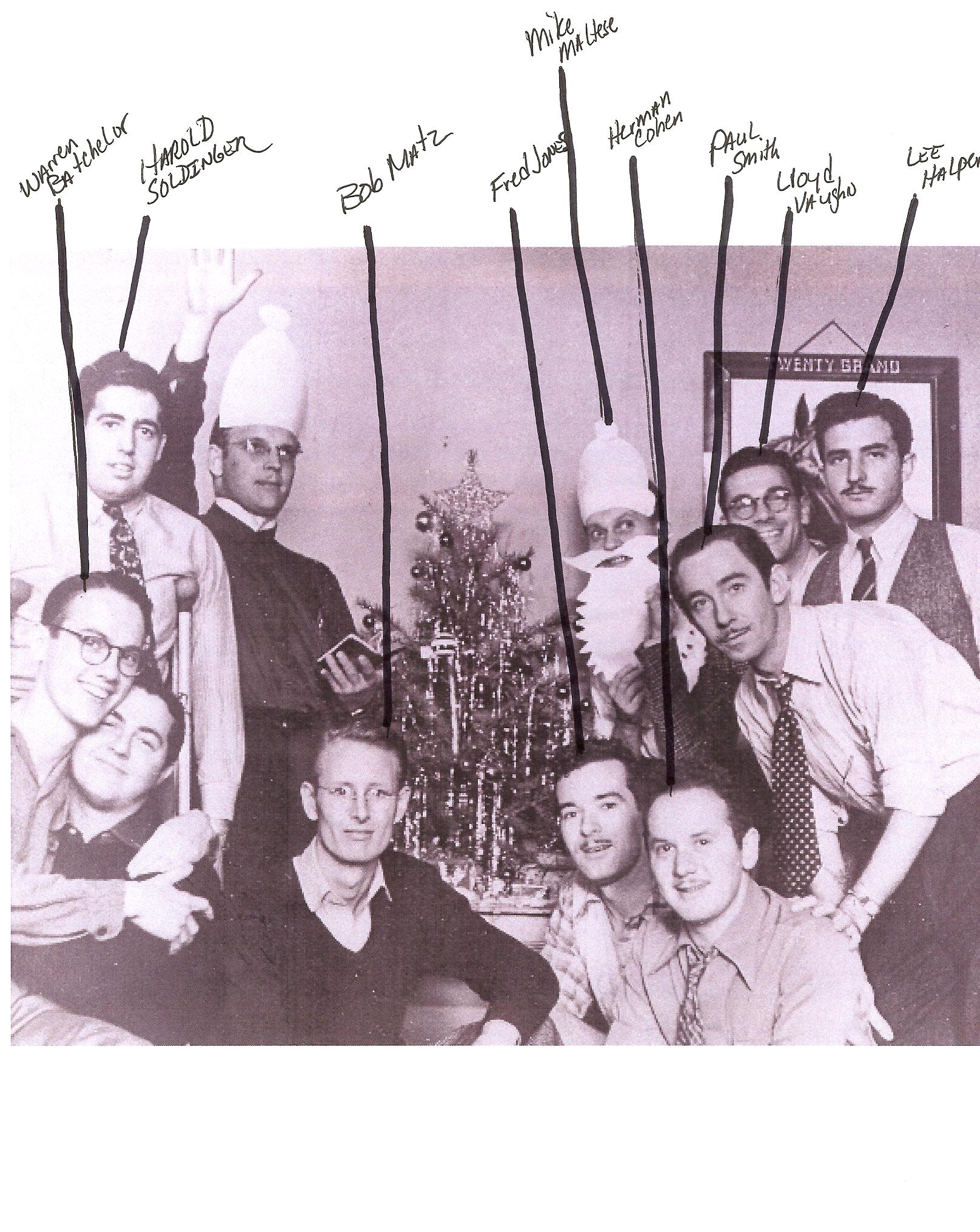 “The people in the picture with the Christmas tree are left top row: Harold Soldinger, Warren Batchelder. The fellow he has his arms around, I don’t know. And, left of him is Bob Matz. Right of him is Fred Jones. Then, Herman Cohen. Leaning on Herman is Paul Smith. Mike Maltese has the paper hat and beard. Next to him is Lloyd Vaughn and Lee Halpern. I don’t know the fellow who is playing the priest.”