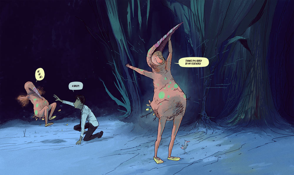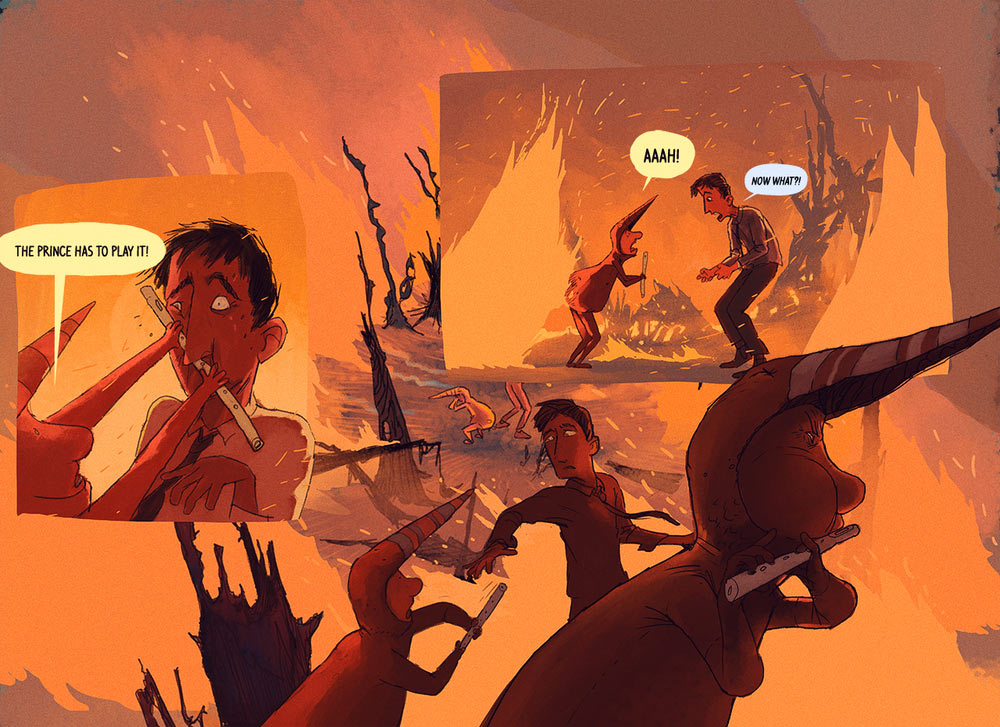 “Traditional comics are great at leaving things to the imagination; readers fill in blanks, and that’s exciting,” Fons Schiedon, director and designer of The Land of the Magic Flute, told Cartoon Brew via email. “But I think there is a tricky balance when comics and animation come together, because you have to be careful about the expectation you create. You can easily run into a disconnect when you give voice and movement to still characters. It emphasizes stillness rather than enhancing it, so I didn’t want to do that, which is why The Land of the Magic Flute’s sound design and animation are mostly limited to backgrounds and effects, which serve to create atmosphere and life, but leave it to the reader to do the same for the characters.”