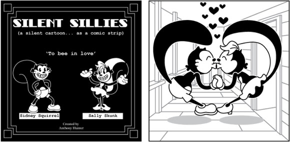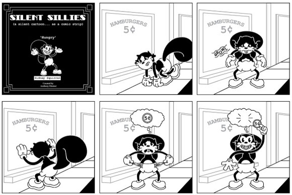 I’m a big fan of retro-animation tributes – here’s a clever one in comic strip form. Ohio-based cartoonist Anthony Hunter has begun posting Silent Sillies (“A silent cartoon… in comic strip form”) one each week on his new website.
