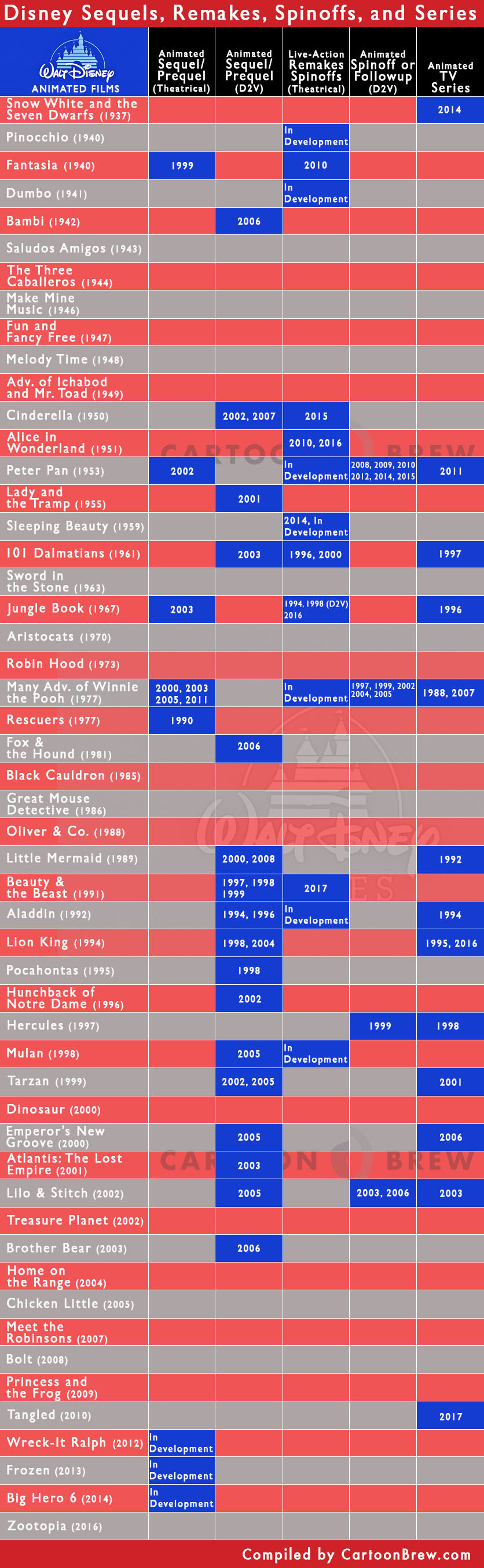 Cartoon Brew created the chart below, which we plan to update periodically, to document how Disney uses its established animated features as a springboard for sequels, spin-offs, remakes, and series. While this chart specifically focuses on the studio’s own theatrical animated features, the same strategy is applied across all Disney-owned brands, including Pixar, Lucasfilm, and Marvel.