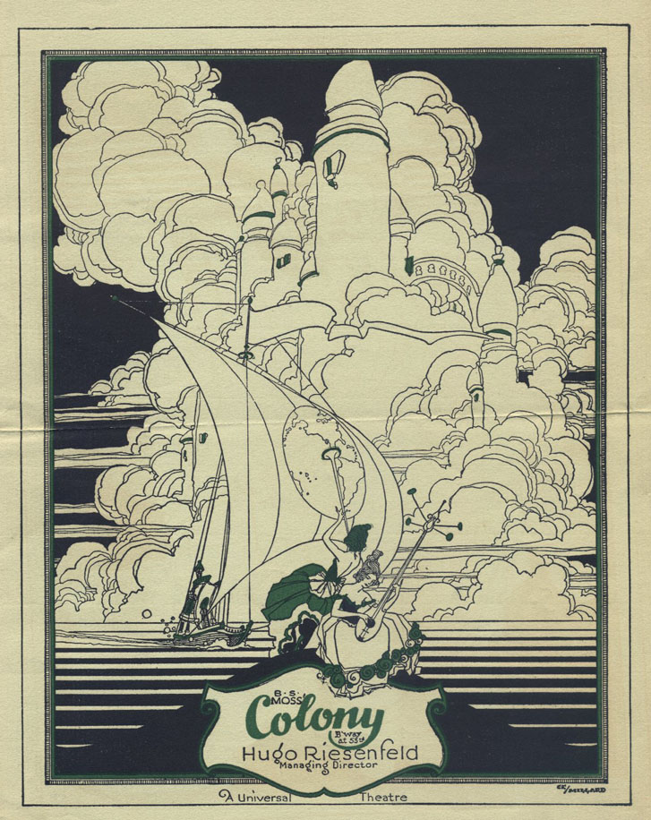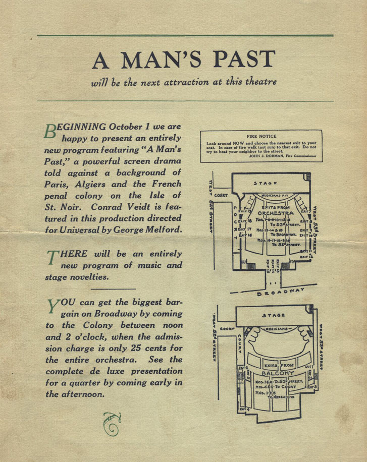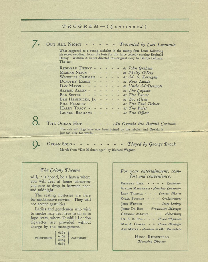 There are a couple of things to note. First off, it has a great cover illustration by C.E. Millard, and a logo which designates the Colony as “A Universal Theatre”. On page 3 you’ll see Disney’s The Ocean Hop, an Oswald Rabbit cartoon, is programmed to play after the feature (as a “chaser”?). Also note that cigarettes are provided free, and there is no tipping the hostesses. The final page features the theatre floor plan and indicates that the admission price is only 25 cents before 2pm.