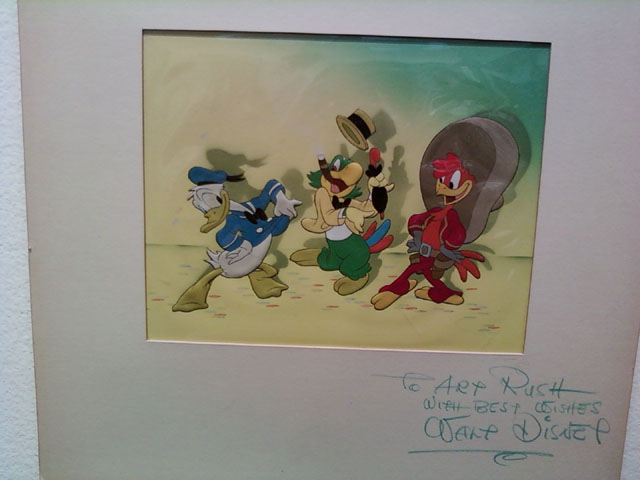 My old friend Mark Trost went to the Roy Rogers auction at Christies today and took some snaps of interest to us at Cartoon Brew. For some reason, Roy was in possession of the original art for the sheet music to Walter Lantz’ Chilly Willy. Does anyone have any theories as to why he would have this? (click thumbnail at left and below to see a larger images). Roy, of course, appeared in Disney’s Melody Time (1948) and narrates the story of Pecos Bill. Below are photos of three cels up for auction from the Roger’s estate: an unusual one representing Pecos Bill, and two production cels signed by Walt to Roy’s agent, Art Rush: Willie The Operatic Whale from Fun and Fancy Free Make Mine Music (1946) – perhaps given to explain that Roy would appear in a musical package film? And a Three Caballeros cel – perhaps symbolic that Roy would appear in a live action animation segment?? Mark also reported that the auction included “a number of letters from Walt to Roy on personal stuff”. There’s also a Mickey Mouse piece. Don’t fret, there’s still time to bid… this material goes up for bid tomorrow (Thursday July 15th) and the estimated prices are relatively low. Let us know if you win something.