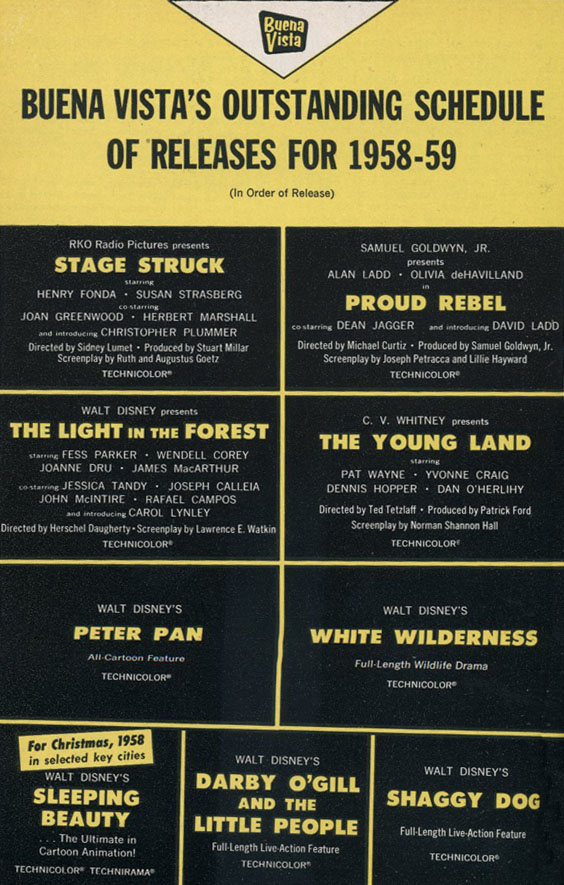 Beginning with 20,000 Leagues Under the Sea (1954), BV became a Hollywood player with a strong slate of promised Disney productions – animated features such as Lady and The Tramp and Sleeping Beauty supplemented with lighter, suitable family fare, mainly westerns and true-life adventures. However, Disney productions alone were not coming fast enough to keep the new distribution staff busy. Like any business, the company’s life blood is a steady stream of new product.