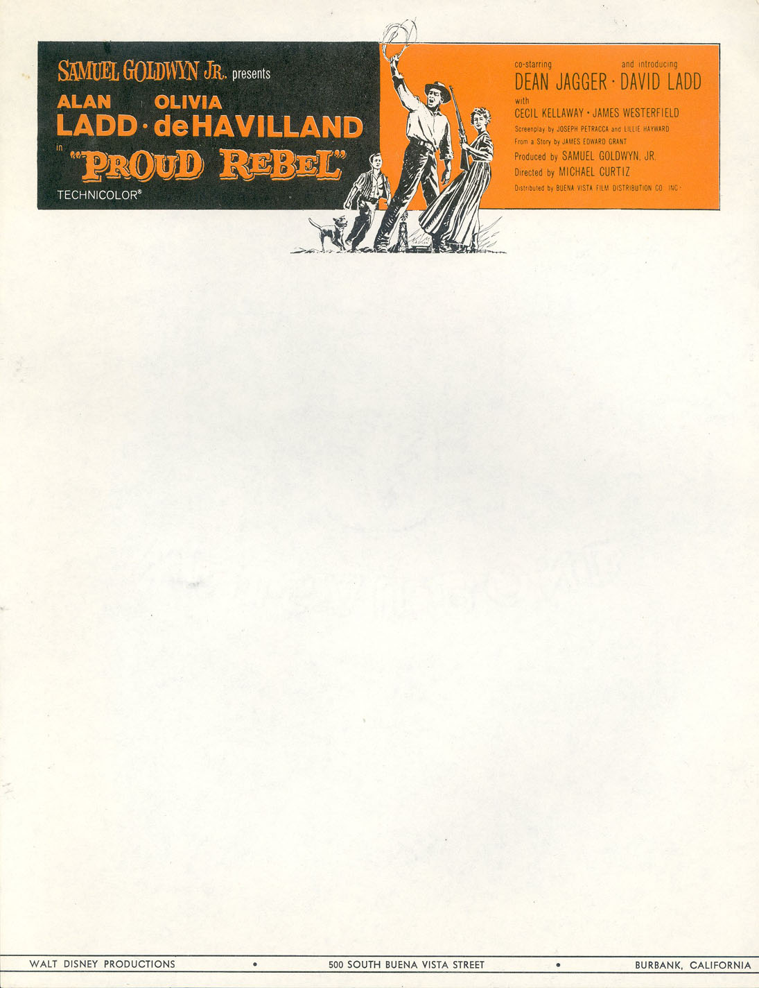 Click thumbnails below to see full size images: left: A 1958 Buena Vista trade ad. Note The Young Land, mentioned in the ad below, was ultimately released by Columbia Pictures in 1959. center: A piece of Disney stationary for Proud Rebel courtesy of Mike Van Eaton. right: The one sheet poster for The Big Fisherman.