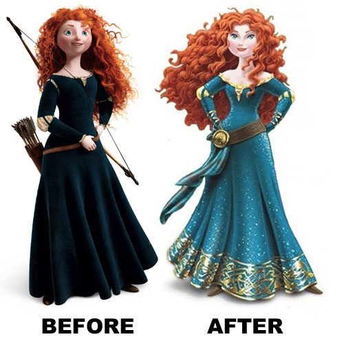 The makeover, which apparently happened to all the Disney princesses when no one was looking, involved dropping 20 pounds, caking on some mascara and giving Merida a Keratin hair treatment. “There’s the hot hair, the coy expression,” wrote Peggy Orenstein, author of Cinderella Ate My Daughter. “Also the obligatory exposed shoulders, slimmer waist, and the bow and arrow replaced by… what is that, a low-slung belt?…Because, in the end, it wasn’t about being brave after all. It was about being pretty.”
