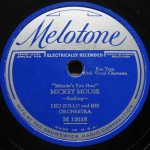 Here’s a treat. Music historian and record archivist Mike Kieffer sent me a copy of his latest find. It’s the first authorized recording made of Minnie’s Yoo Hoo in 1930 which, Mike says, “…was not released until about January 1931. However, this still predates the next earliest Mickey Mouse song, which is by the Varsity Eight from late 1931. It’s also the only instance I can recall of a piece composed by Carl Stalling issued on a commercial record, other than perhaps children’s records from the 1940s and beyond. I think the vocalist is the bandleader himself, Leo Zollo, but I’m not sure about that. The personnel is apparently unknown, as is the exact recording date, but it’s sometime in May-June of 1930.” Click on the label at left to see it larger, and you can listen to the delightful track here: