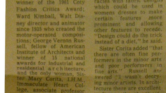 What’s so odd about Ward’s participation is that the topic of the debate was “Is Couture Design an Art Form?” It’s hard to imagine many other animators from that time who would have had the curiosity and interest to participate in such a discussion. The other panelists at the talk were equally respected in their fields: fashion designer Gustave Tassel, architect George Vernon Russell and silkscreen artist Sister Mary Corita. The debate over whether fashion design is art or not has long been settled (see the record-breaking success of the recent Alexander McQueen exhibit at the Met), but nevertheless, it’s fun to read their thoughts and gain some historical perspective on the issue.
