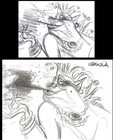 Forged storyboard drawing of Ursula (top) and original on bottom